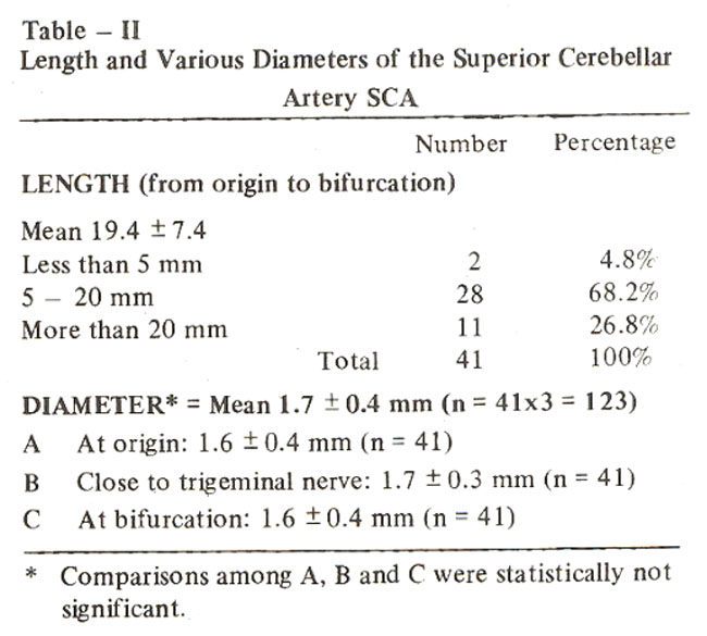 The diameter of the SCA from its origin to bifurcation was fairly uniform (Table 1), a finding consistent with that of Mehta et a15. The length of the artery from its origin to bifurcation (Mean 19.4 ± 7.4) is in agreement with Hardy and Rhotson3.