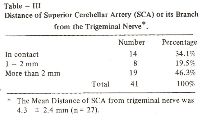 We found that in 34.1% of cases the artery was in actual contact with the trigeminal nerve and in another 19.5% it reached very close to it (within 1-2 mm). This raises the percentage to 53.7. Hardy and Rhotson3 have already reported this neurovascular relationship in 52% of cases, where as, Mehta et al. have reported actual contact in only 8.3%; our observation seems to confirm that of the previous author.