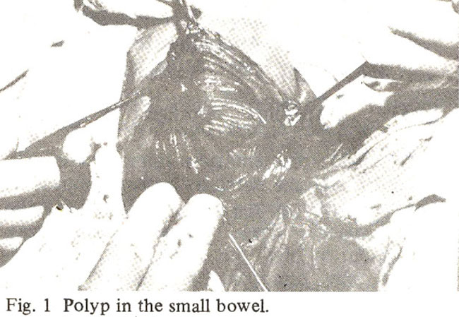 There were at least seven polyps in the proximal jejunum. No polypswere detected in the distal ileum and the large gut.’ Resection of the gangrenous portion with end-to-end anastomosis was performed and four readily accessible polyps in the viable proximal jejunum were removed. His further post-operative recovery was uneventful. Post-operative Barium enema and colonoscopy did not show any polyps in the large gut.