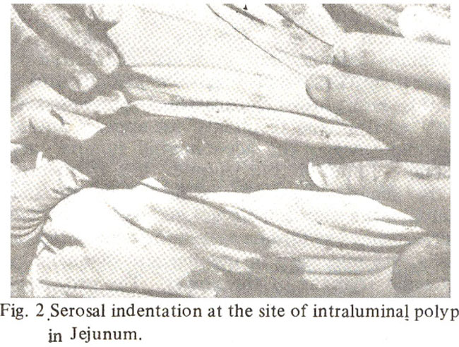 On examination, he was of dark-complexion with, pigmentation of the oral mucous membrane and heavily pigmented skin of the palms and soles. Abdominal examination revealed a distended and tense abdomen with two palpable lumps in the left hypochondrium. X-Ray abdomen showed the pattern of intestinal obstruction. Fig. 1 Polyp in the small bowel.