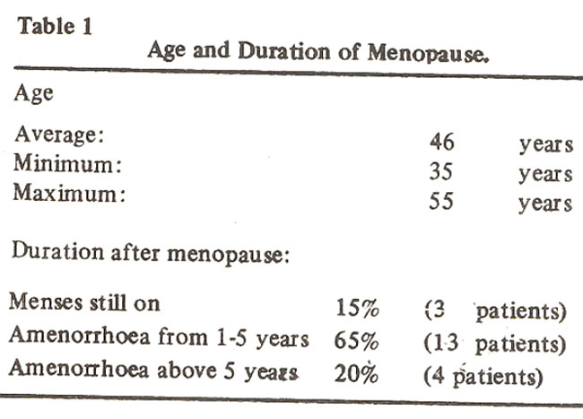 The age of the patients ranged from 35 to 55 years. Sixty five percent of the patients had menopause 1-5 years prior to the consultation while 15% were still menstruating (Table I).