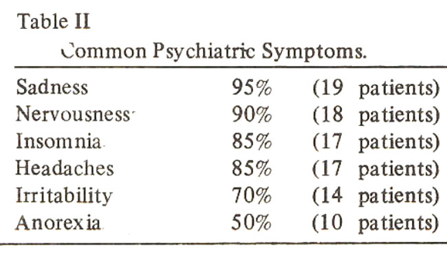 The most commonly reported symptoms were sadness and nervousness (90%) followed by insomnia and headaches (80%). Irritability was reported in 70% and 50% bad anorexia (Table-II).
