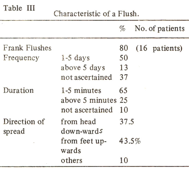 None of them had any past history of such complaints. 80% reported frank flushes with sweating while the remaining 20% felt a wave of warmth moving’ on the body accompanied by sweating but no obvious redness of face or trunk. Some characteristics of a flush are presented in Table-III.