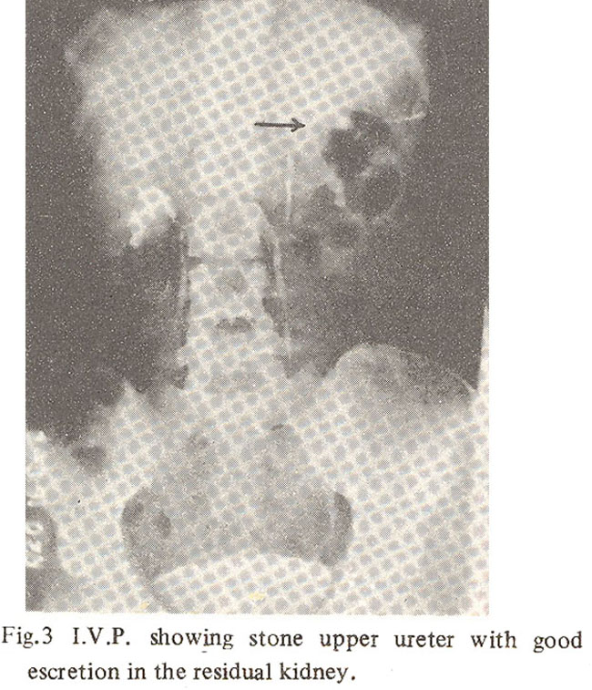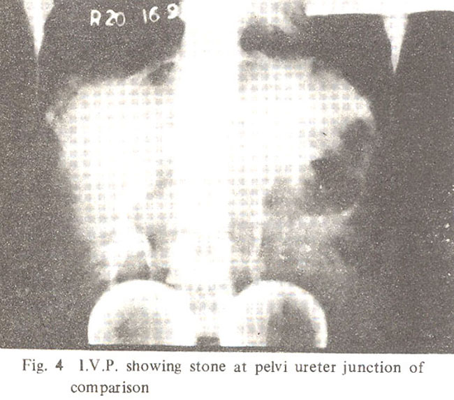 A tumour of kidney was suspected with likely diagnosis of carcinoma. Exploration of the left kidney was performed on 30th June, 1976. The left kidney had duplex ureter. A tumour was found occupying the middle portion of left kidney. Para-aortic lymph nodes were not involved. There was an indentation over the surface of the kidney denoting the line of demarcation between upper and lower segments of kidney. The arterial blood supply to the two segments was independent and so was the venous drainage. There was a margin of about 1 cm. of normal tissue between the tumour and the indentation. A lower 2/3rd partial nephrectomy was performed. Histological examination confirmed the diagnosis of Adenocarcinoma (clear cell, papilary type), which was well encapsulated with enough nnrgin of normal tissue all around. Post operative recovery was uneventful. No radiotherapy or chemotherapy was given. I.V.P. 16 weeks after operation demonstrated a good function in the remaining segment of the left kidney (Fig. 3). She had regular check up since her operation. In January, 1978 she had microscopic haematuria which cleared spontaneously. Further I.V.P. at intervals were normal. In December, 1982 she had another bout of haematuria. On I.V.P. a uretic stone was detected in the left ureter (Fig. 4).