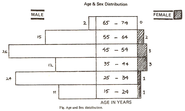 One hundred adults with confirmed duodenal ulcer were included in the study. The study was carried out on outpatients basis. Of 100 patients 90 were males and 10 females (M:F 9: 1) with their ages ranging from 18 years to 74 years (Mean age of 40.63 years) as shown in Fig.
