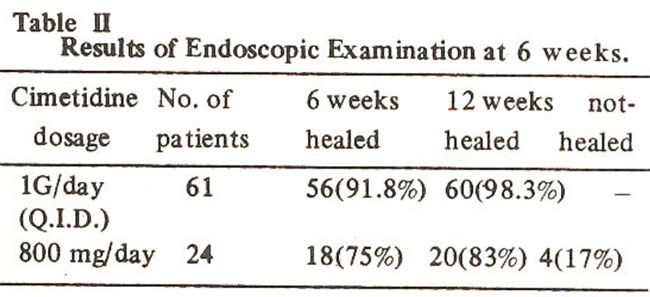 The healing rate of 92% following six weeks treatment with cimetidine 1G/day is better than the results from trials of similar methodology as reviewed by Bardhan (1978). The 75% healing rate on cimetidine 400 mg b.d. is similar to Q.1.D. regime as patient population was not strictly comparable. As expected the incidence of healing increased with the longer duration of treatment to cumulative proportions of 98% and 83% respectively at twelve weeks with both regimen.