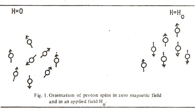 The hydrogen nucleus consist of a proton only; this proton has a half spin. Hydrogen nuclei in a zero magnetic field orientated randomly and align itself parallel or antiparaliel when magnetic field Ho is applied as shown in Fig. 1.