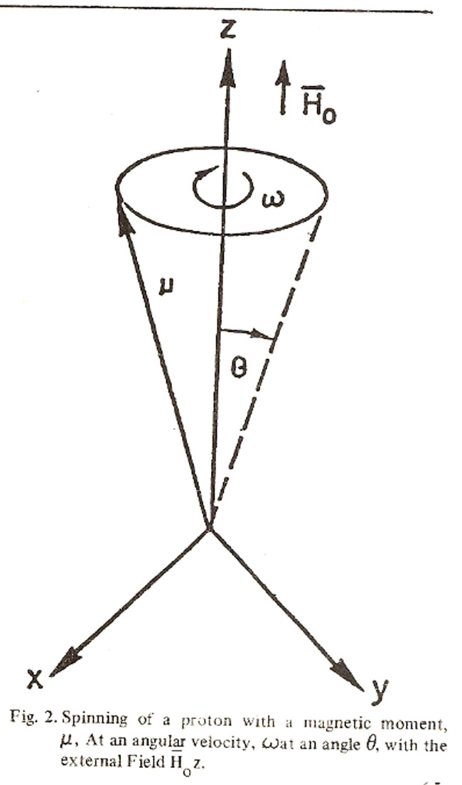 A hydrogen nucleus as mentioned earlier has angular momentum. As a consequence. spin axis proton will align itself in the presence of static magnetic field Ho but because of thermal agitation do so incompletely and precess at an angle 0 about Ho. This precession. generally known as Larmor precession (Fig. 2)