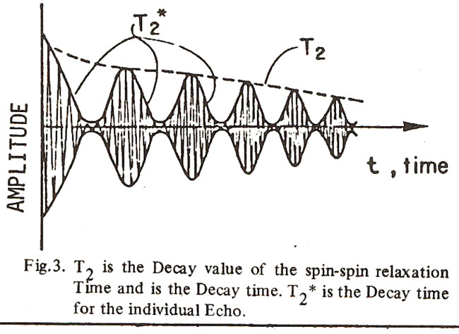 T2 which is the intrinsic component of the signal decay of the sample, is a result of energy interaction between spinning nuclei, hence it is called spin-spin relaxation (Fig.3).