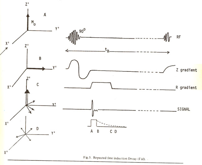 An FID signal is produced using a 90o RF pulse which is sampled and then another 90o RF pulse is applied after a time interval of tR before the magnetization reaches its equilibrium value of Mo along the +Z axis. This inturn initializes M2 to zero after the 90o RF pulse, recovered to a value