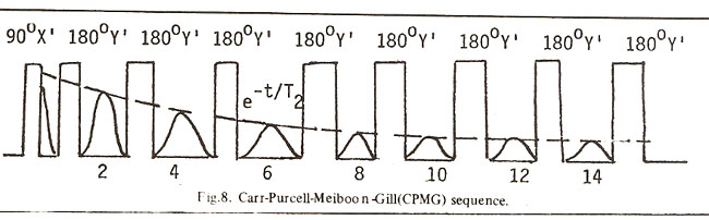 produce a signal strongly dependent on T2. RF pulses applied in this sequence is 90ox’ r -l80oy’ . 2r - 180oy’ . 2r . 180oy’.The phase coherence is lost after the first echo, however, it refocussed by the application of 1800 pulse r s later. Thus if a sequence of pulses at times (2n + I) r are subjected, a train of echoes commonly known as Carr-Purcell-Meiboon-Gill chain at time (2n+2) r are formed (Fig. 8).