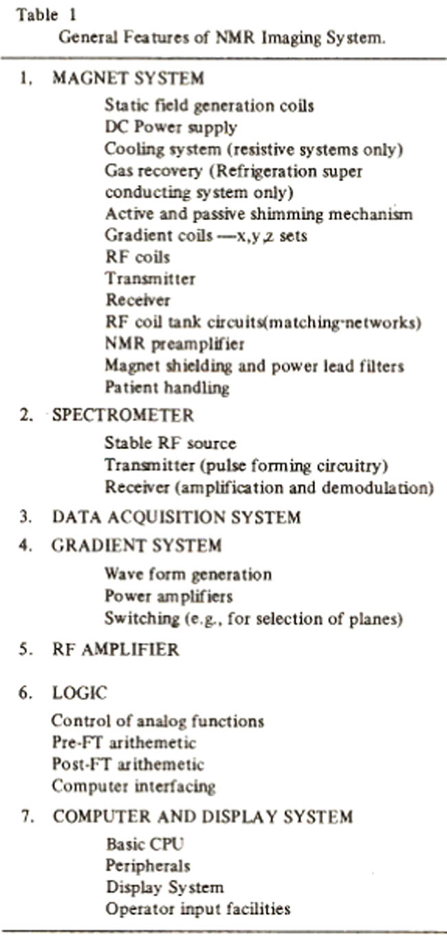 Table I and are briefly discussed below. In NMR medical imaging, the patient in a clinic lies on a moveable bench that is guided into a large circular gantry with axis of the gantry usually along the long axis of the patient. The gantry houses a massive magnet to produce a strong and stable static axial magnetic fields, coils to produce gradients in this field and an RF coil to transmit the stimulating pulses and detect the NMR signal, which is reconstructed by computer to give cross sectional images.
