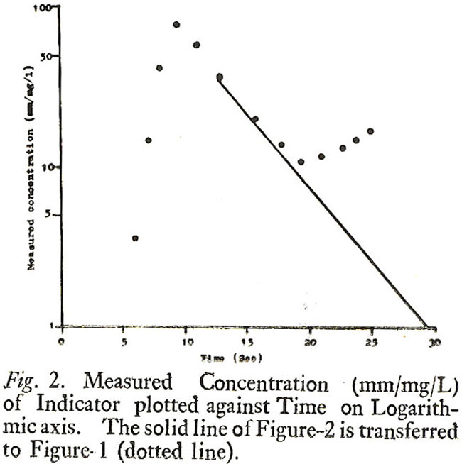 The time-concentration curve consists of initial rapidly ascending phase followed by a slower downstroke and a secondary recirculation curve, which occurs before the first pass effect has had time to fully decay. This recirculation curve poses a difficulty in the assessment of the mean indicator concentration. This difficulty can be overcome by extrapolating the descending limb towards the base. For practical purposes a point at which the indicator concentration is 1% of the peak concentration is (arbitrarily) chosen as the end of the disappearance time. The indicator dilution curve replotted on semilogarithmic paper is, therelore, extrapolated to this point (Fig. 2).