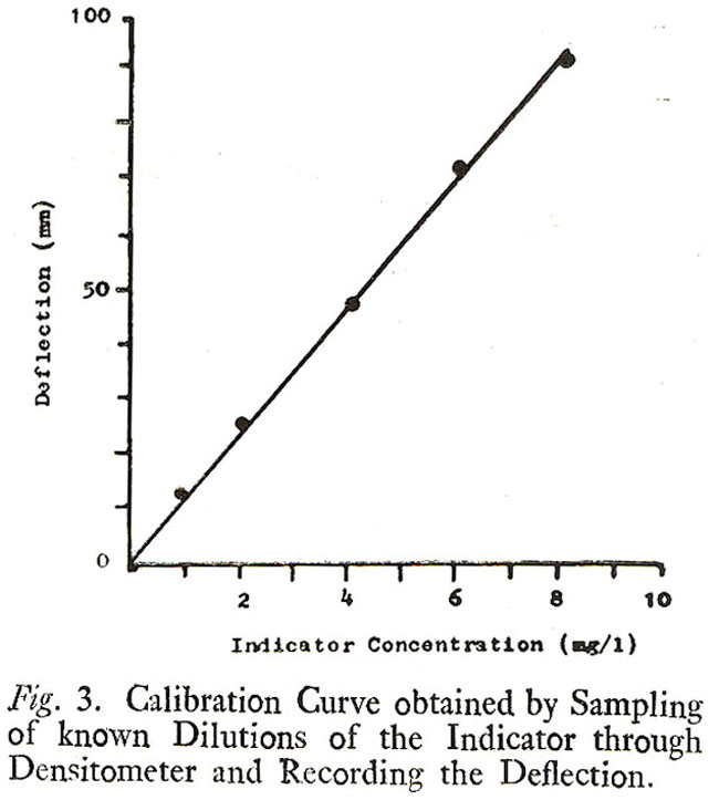 obtained by sampling the known quantity of dye through densitometer and measuring the deflection in mm. The base of the curve is also measured in mm. Now by the following formula CO. can be calculated.