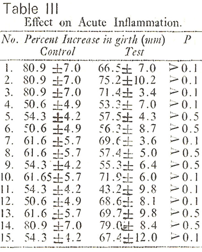 Experiments were performed on male albino rats of Sprague Dawley strain, weighing 100-120 grams. A suspenskn of 0.6 mg powder of dead Mycobacterium Kansasi in I ml of liquid paraffin was injected into the right foot pad of the rat. The extracts (in the form of suspension in normal saline) were administered orally through a polythene tube in 500 mg/kg bcdy weight doses just before the injection of the adjuveut (0 day) and on the 1st and 2nd day after the injection. The animals in tile control group received equivalent amounts of normal saline. The circumference of the injected pad was measured with the help of a thread on the zero and 3rd day of the injection. The percentage increase in the girths of the inflammed paws were calculated in the control and test groups for the purpose of comparison (New bould, 1963; Khanum and Qayum, 1969).