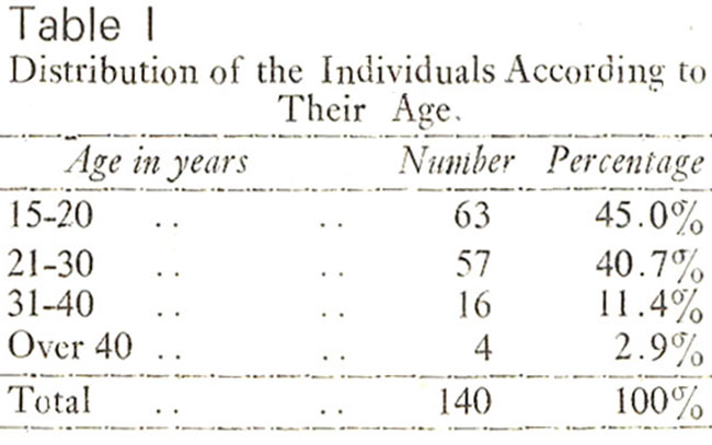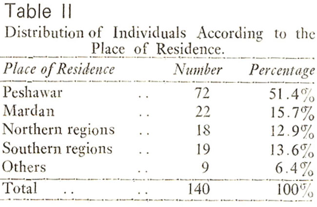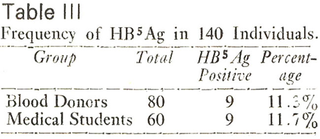 Studies were conducted on sera obtained from 80 blood donors (Khyber Teaching Hospital and Lady Reading Hospital, Peshawar) and 60 apparently healthy medical students. The reverse Passive Hemagglutination test was used for the detection of HB5Ag .All the blood donors were healthy and there was no history of hepatitis or parenteral exposure. The distribution of these individuals according to their age group and place of residence is shown in Table I and II respectively.