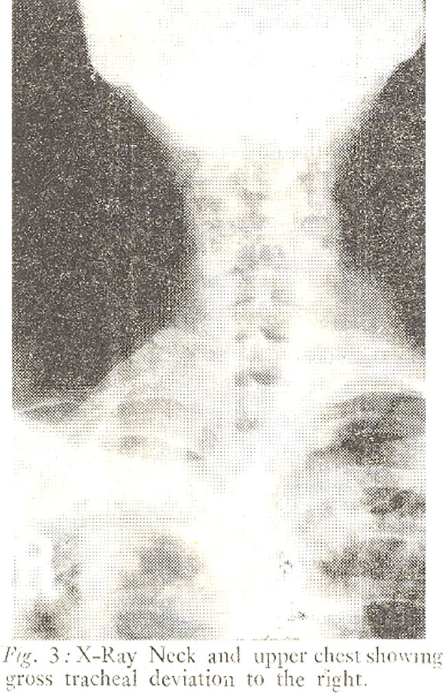 A 56 years old male, resident of Rawalpindi, businessman by profession, attended the E.N.T. Department Central Government Poly Clinic, Islamabad on 15-12-1980. His main symptoms were dysphagia, pain radiating to the right ear and a change in the character of his voice, having become rough and muffled. He looked pale and depressed and was concerned about having cancer of the throat. These symptoms were of 8-10 weeks duration and were getting increasingly worse. Five years back he was treated for pleural effusion and pulmonary tuberculosis for about a year, following which he was well. About ten weeks prior to consultation he had noticed a changing voice and gradually increasing dysphagia alongwith a dry cough. He had been smoking 40-60 cigarettes a day.