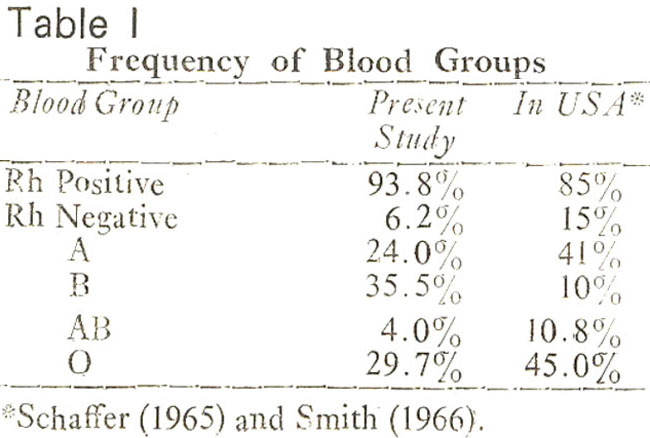 Only 6.2% of mothers in this study were rhesus negative as against 15% among" the white population of England (Keay and Morgan, 1974) and USA (Schaffer, 1965). It is also less than the 7% among American negroes but more than the 1% among Chinese (Behrman, 1975).
