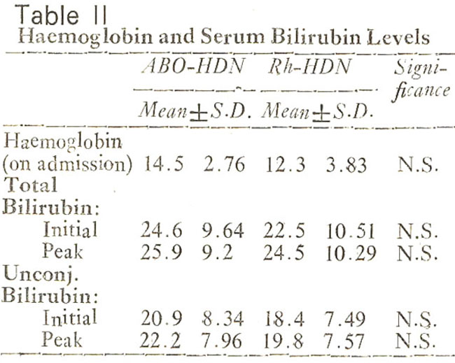Of 414 jaundiced neonates studied 108 had physiological jaundice. These have not been included in further analysis. Out of 306 cases of Pathological jaundice, 48 (15.7%) had ABO-HDN and 39 (12.7%) had Rh-HDN. The mean weight of ABO-HDN group was 2666±466 grams and those with Rh-HDN was 2678±449 grams. The mean age on admission of ABO-HDN group was 4 36±2 8 days and that of Rh-HDN group was 51±5 7 days. The hacmoglobin and serum hiliruhin levels are shown in Table II.