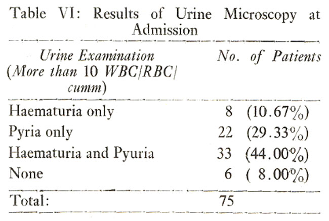 In 75 patients who were investigated, pyuria with or without haematuria was the most frequent finding. The results are show in Table-VI.