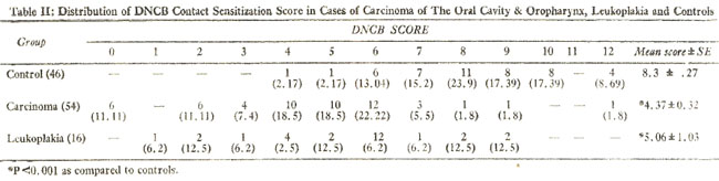 Skin response to DNCB, PPD and Candida extract antigens was depressed in carcinoma and leukoplakia patients as compared to controls in the present study. Although statistically there was no difference (P>0.05) in number of positive cases for DNCB in carcinoma, leukoplakia and control groups; however, the mean DNCB score was significantly lower (P<0.001) in carcinoma and leukoplakia patients as compared to the controls (Table I and II). These findings are in agreement with many other workers showing depressed immunity to DNCB skin reactivity in Hodgkin\'s disease (Aisenberg, 1962), lung cancer (Krant et al., 1968), squamous cell carcinoma of the rectum (Bone and Camplejohn, 1973), and urinary tract (Catalona et al., 1974).
