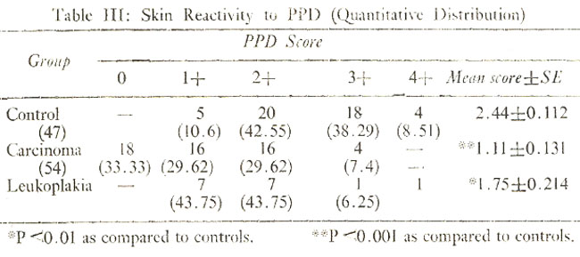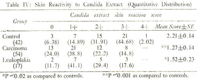 Skin reactivity to PPD and Candida extract was reduced in significantly lower (P<0.001 and P<0.05, respectively) number of carcinoma patients as compared to controls. The mean PPD and Candida extract scores were also significantly lower in carcinoma (P<0.001) and leukoplakia (P<0.01 and <0.02, respectively) patients as compared to controls (Table I, II, IV). A reduction in the immunecompetence as assessed by skin responsiveness to tuberculin has also been reported in advanced cases of breast carcinoma (Hughes and Mackay, 1965), bronchogenic carcinoma (Krant et al., 1968), Hodg-kin\'s disease (Schier et al., 1956) and nassopharyn-geal carcinoma (Wara et al., 1975; Chan et al., 1976). A similar reduction of immune competence has also been reported with various other antigens such as candidin, mumps, etc in a variety of malignancies and autoimmune diseases (Thompson et al., 1975).