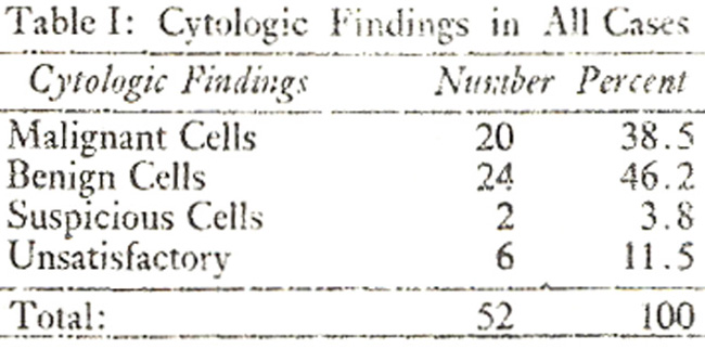 Table-I shows that aspiration biopsy was successful in 46(89.5%) cases while no cellular material was obtained in 6(11.5%) cases. A correct diagnosis was made in 44(84.6%) cases while in two cases cells were seen but the diagnosis was inconclusive. No false diagnosis was made.