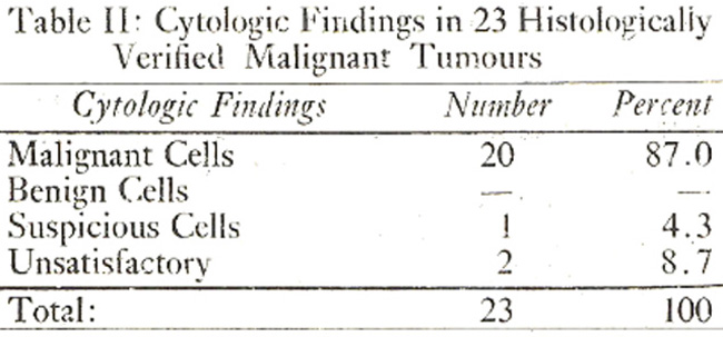 Table-II shows the accuracy of cytologic diagnosis in 23 histologically verified malignant lesions of breast. In 20(87%) cases a correct diagnosis of carcinoma was made on cytology. In 1(4 3%) case the smear showed atypical epithelial cells but was rich in inflammatory exudate so a conclusive diagnosis was not made. In 2(8.7%) cases aspiration did not yield enough epithelial cells for diagnosis.