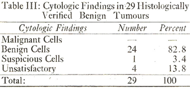 Table-III shows the cytologic findings in 29 histologically verified benign tumours. Benign cells were seen in 24(82. 8%) cases. In one (3.4%) case a mitotic figure was seen and a suspicion of carcinoma was raised. In 4(13.8%) aspiration yielded either a cellular cystic fluid or it was unsuccessful.