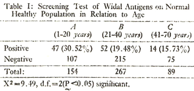It was further noted that there was a significant (P<0.05) association between age and typhoid agglutinins (Table I). The highest percentage of positive cases are recorded in group A (1-20) and the lowest in group C (41-70 years).