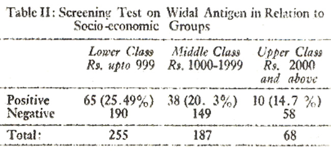 On screening test with slide agglutination technique the Widal test was positive in 113 (22.16%). The results under report are in agreement with the findings of Towne (1934) who reported a higher incidence of Widal agglutinins in South Dakota as 21 per cent of normal population.