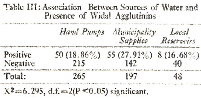 A significant association (P<0.05) between sources of water and Widal agglutinins was noted. Highest percentage 55(27.91%) of positive cases was recorded in individuals using municipality water (Table III).