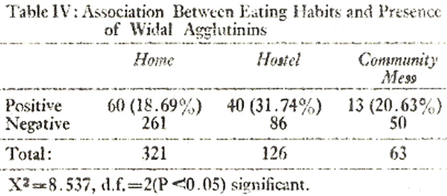 The significant association (P<0.05) between eating habits of individuals who lived in the hostels showed the maximum percentage (31.74) of positive Widal tests and minimum percentage was shown by those who had their meals at home (Table IV).