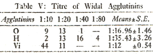 The sera showing positive Widal test on screening, were subjected to quantitative assessment of Widal agglutinins. The mean titres of O,H, and Vi agglutinins were recorded as 1:16.96±1.46, 1.35:43±3.26 and 1:12±0.54, respectively (Table V).