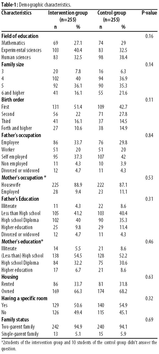There were 10 schools in the district where the study was conducted with 1020 third-grade female students. Of them 510 (50%) were selected as the sample. Demographic characteristics at baseline were noted (Table-1).