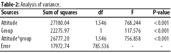 A repeated measures ANOVA was used to determine significant effect of intervention on the mean of attitude score over time. It was higher among the subjects than the controls (91.69±9.43 at baseline to 99.95±8.26 immediately after intervention, and finally to 112.13±6.98 two months after intervention; p<0.001) (Table-2).