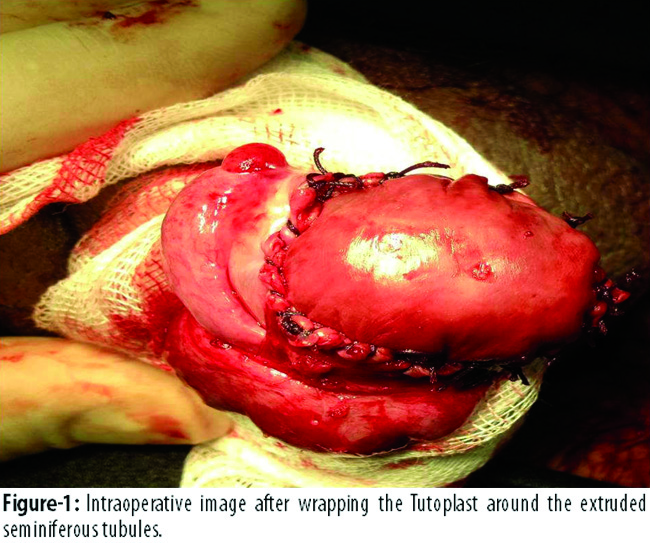 The patient underwent a corporal repair of penis and exploration of right hemiscrotum through a transvers scrotal incision. There was haematoma, ruptured tunica albuginea and extruded seminiferous tubules in the right hemiscrotum. Haematoma was evacuated, but the ruptured testis could not be closed primarily because extruded seminiferous tubules and a big tissue defect of tunica albuginea did not allow the apposition of the tunica albugineal edges. All nonviable extruded seminiferous tubules were excised. A graft of Tutoplast® (Tutopatch®, Tutogen Medical GmbH, Germany) processed bovine pericardium was wrapped around the extruded seminiferous tubules and sewn to the free edges of the tunica with 4.0 absorbable sutures (Figure-1).