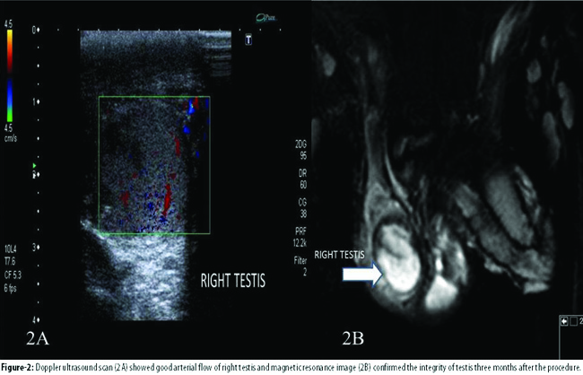 and magnetic resonance imaging (MRI) revealed normal integrity and volume of the right testis (Figure-2B). Physical examination was also normal. No complications were detected during the follow-up period.