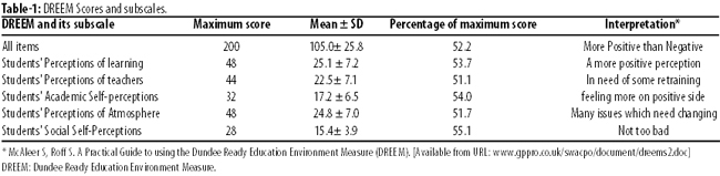 Overall mean score found positive was 105.0±25.8 (Max: 200). Corresponding scores in the subscales were: student's perception of learning 25.1±7.2 (Max: 48); social self-perception 15.4±3.9 (Max: 28): academic self-perception17.2±6.5 (Max: 32); perception of teachers being in need of some re-training 22.5±7.1 (Max: 44); and perception of atmosphere as having many issues needing a change 24.8±7.0 (Max: 48) (Table-1).