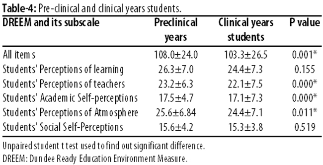 Data was analysed by using SPSS 17. Descriptive statistics were used to calculate mean and standard deviations (SD) of total DREEM and the five subscales. Unpaired t test was used to identify statistically significant differences between the subscales in the pre-clinical and clinical students as well as between genders. The level of statistical significance was set at p<0.05.