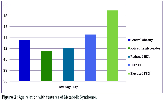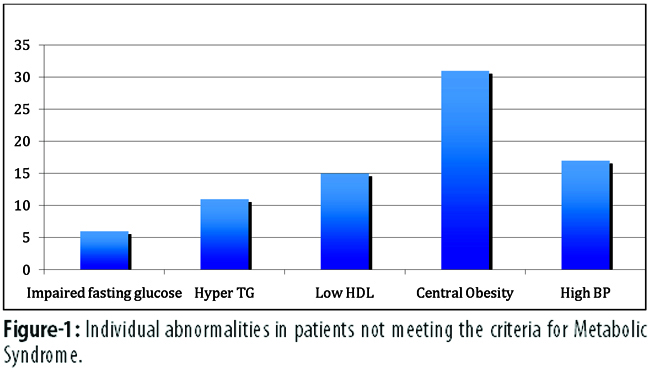 Among those without MS, 20(79.16%) had hypertension, 14(54.16%) had hypertriglyceridaemia, 18(70.83%) had low HDL and 11(41.66%) had glucose dysregulation (Figure-1).