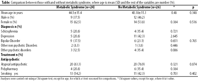 There were 50 patients with ages ranging from 18 to 72 years and a mean of 42.3±15 years. There were 29(58%) females and 21(42%) males. Depression was found in 16(32%) patients, followed by Bipolar Disorder 15(30%) and Schizophrenia 9(18%). Overall, 40(80%) participants were taking antipsychotics (atypical antipsychotics) and 9(18%) needed antipsychotic poly-pharmacy. Cardiovascular risk factor (smoking) was present in 25(50%) patients. Of the total, 24(48%) patients had MS, while 26(52%) were without it. There were no statistically significant differences in any of the clinical or demographic characteristics between the two groups (Table).