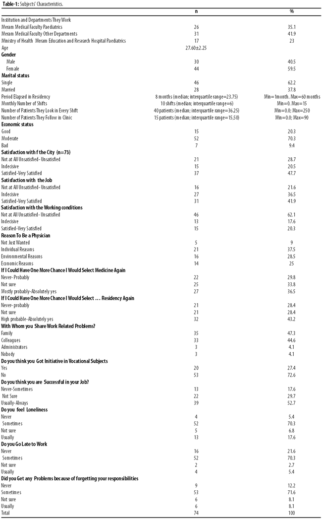 It is known that medical profession puts pressure on physicians from the beginning of education years.1-3 This leads to anxiety, depression, loneliness, and burnout in physicians and affects their psychological well-being, job and life satisfaction. Personal facts like successes and expectations; professional facts like work environment and conditions; social facts like status and prestige contribute to job and life satisfaction.4-7 Loneliness, which is defined as the perception of one\'s social relations at under-expected levels, also triggers negatively biological stressors.8-10 Life satisfaction is closely related to loneliness, depression and suicidal attempts.8,11 In addition, feelings about job is related to both physical and psychological well-being.5,12,13 Job satisfaction is a positive feeling achieved when expectations are met.14 Contrary to job satisfaction, the burnout is a negatively affecting process, a response to chronic feelings and personal stresses about job. The burnout has three dimensions: emotional burnout, depersonalisation, and decrease in success. It shows itself as the loss of wish, energy, idealism and aim.15-18 It could be influenced by conditions, environment, job satisfaction, personal factors and income.12,16,17,19-23 Burnout is generally expresses itself in idealistic and highly motivated persons. Such people have high expectations of their profession and profound and long-term sustenance of such feelings results in stress, alienation, anxiety and depression.18,24 Medical education accepts idealistic and motivated students by selection and motivates them for the true diagnosis and treatment during all their practice years. Naturally, the stress and anxiety levels of the physicians become high. In more than half of the family physicians in a study, anxiety was found over the cut-off level.25 The irony is that the wellness, the mood in other words, the psychological health of the physician deteriorates. There have been a number of studies in this regard done with family physicians, general practitioners, obstetricians, gynaecologists and psychiatrists.2,5-7,12,16,17 Also, there have been such studies involving Residents and Lecturers, but there are very few studies analysing the mood, working conditions and their correlations in paediatrics residents.14 In these studies, mainly depression was analysed, but other parameters were not touched altogether. In this study, we planned to analyse the anxiety, depression, loneliness, burnout and job satisfaction levels in paediatrics Residents, and to compare their interactions with the Residents of other departments.