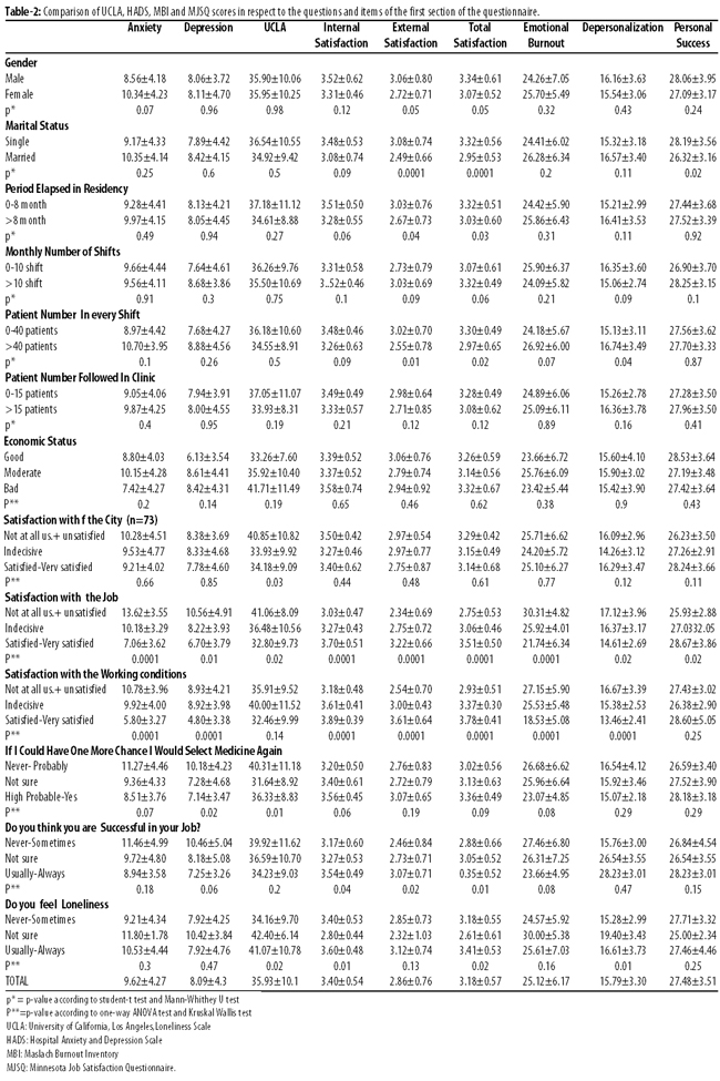 Negative correlations were found between working time and internal satisfaction (r=-0.25), external satisfaction (r=-0.29) and total satisfaction (r=-0.30). Positive correlations were found between emotional burnout level of the Residents and anxiety, depression and UCLA scores (r=0.74; r=0.65; r=0.36respectively), and negative correlations were found for internal, external and total job satisfaction (r=-0.57; r=-0.54; r=-0.61respectively).
