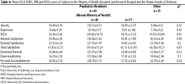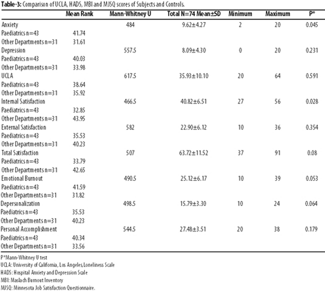 Methods: The cross-sectional study was conducted at Necmettin Erbakan University, Meram, and Konya Meram Education and Research Hospital, Turkey from January to June 2011, and comprised paediatric Residents and their counterparts from other departments who formed the control group. While maintaining confidentiality, a questionnaire was used to collect data that had elements of the University of California, Los Angeles, Loneliness Scale, Hospital Anxiety and Depression Scale, Maslach Burnout Inventory and Minnesota Job Satisfaction Questionnaire. SPSS version 13 was used for statistical analysis.