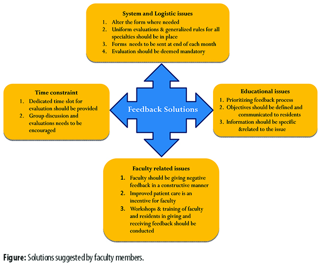1. As for the faculty-related issues, all members agreed that feedback is important and a key factor for Resident learning. However, 42(86%) participants stated that there is some apprehension regarding the provision of negative feedback which may ultimately reflect on their teaching dossier as low ratings by Residents on their evaluations. The same participants reported that they were not appropriately trained to provide feedback. Also, 11(22.4%) faculty members stated that since there is no incentive for the faculty on their involvement in the educational activities, they are reluctant to take time out from their clinical schedules.