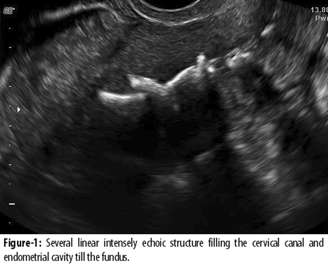 A 26-year-old multiparous woman was referred to our department with irregular vaginal bleeding, lower abdominal pain and chronic vaginal discharge. She had a history of induced abortion three years ago. She described an unsafe abortion episode. Her medical history revealed irregular menstrual cycles and minimal dysmenorrhoea for a year. She repeatedly approached her family physician with chronic vaginal discharge complaint. She had been empirically treated for vaginitis and pelvic infection. None of these treatments were based on a documented cause of PID or sexually transmitted disease (STD). She had never been evaluated with pelvic or transvaginal ultrasonography after abortion. Her first general physical and pelvic examinations were performed in our hospital. On pelvic examination, the uterus was normal in size and position. The uterine and adnexal tenderness, and purulent vaginal discharge suggestive of PID was detected on pelvic exam. Transvaginal ultrasound revealed several linear intensely hyperechoic structure filling the cervical canal and endometrial cavity till the fundus and minimal fluid collection was detected in the Pouch of Douglas (Figure-1).