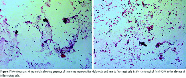A 30-year-old Afghan male resident of Quetta, Pakistan, with no known comorbids suffered a road traffic accident which caused depressed, compound fracture of the skull. On radiological examination X-ray skull also revealed pneumocephalus. Nine days later, the patient visited the general physician with complaints of fever, headache, neck stiffness and clear, watery discharge from the nose. A lumbar puncture was performed and CSF was submitted to the laboratory for necessary examinations. Gram stain of the CSF revealed no inflammatory cells with numerous gram-positive diplococci and rare to few round yeast cells. India ink staining was positive for encapsulated yeast cells. Due to financial constraints cryptococcal antigen test could not be performed. Culture revealed growth of b-haemolytic colonies identified as S. pneumoniae based on colony morphology, gram stain and sensitivity to optochin. S. pneumoniae was found susceptible to chloramphenicol, erythromycin, tetracycline, ofloxacin, vancomycin and resistant to penicillin with minimum inhibitory concentrations (MIC) of 0.25 µg/ml. Along with S. pneumoniae, few creamy white colonies were grown on sheep blood and chocolate agar. These colonies were isolated and inoculated on Sabouraud\'s Dextrose (SDA) agar and Corn Meal Tween (CMT) agar. At 48 hours, it was identified as cryptococcus neoformans based on urea positivity, rounded budding yeast cells on CMT agar. Commercially available biochemical system API 20 AUX further verified the identification of C. neoformans (API #2107133-98%). This isolate was found to be susceptible to amphotericin (MIC <0.12 µg/ml), fluconazole (MIC 0.25 µg/ml) and voriconazole (<0.015 µg/ml).3,4