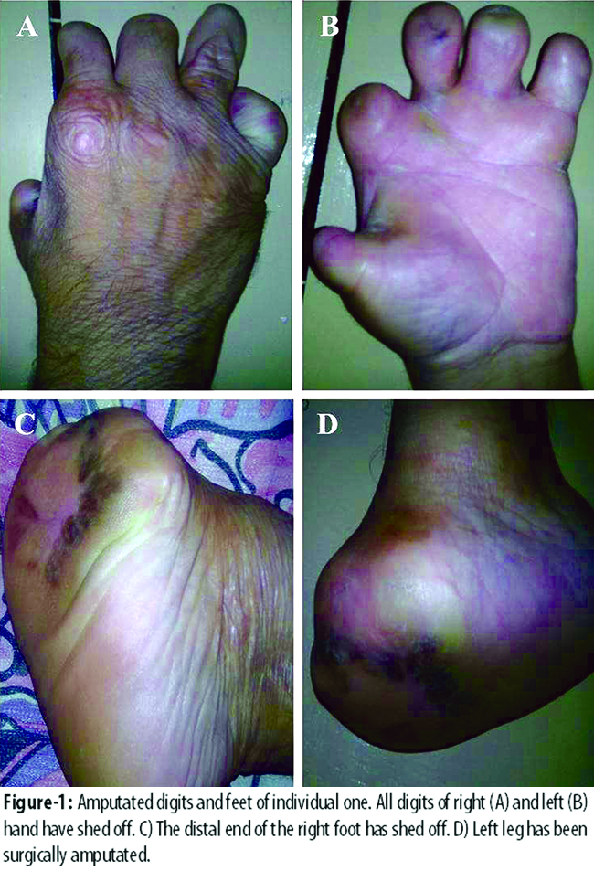 Two cases of HSAN II presented in September 2014. Patient I was a forty five year old male with a long standing diagnosis of HSAN II. Since childhood the patient did not have any pain sensation, which resulted is his minor and major injuries to go unnoticed for long periods. Severe infections, bone fractures and self-mutilation eventually led to shedding of digits of both hands (Figure-1 A and B) and the distal end of right foot (Figure-1 C). Due to necrosis and infection the left foot had to be surgically amputated above the ankle (Figure-1 D).