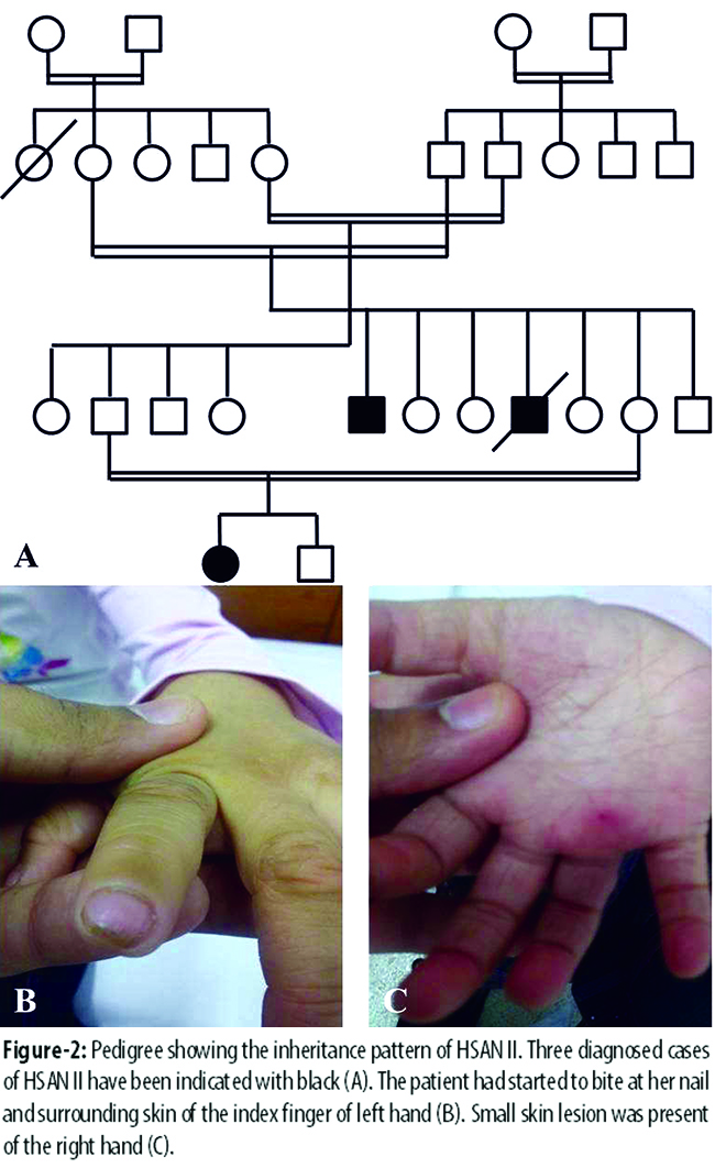 These events left the individual severely handicapped. However, no other systematic or neurological deficit was reported. Younger brother of the patient was also diagnosed of HSAN II and also had shedding of digits and limbs. The brother died at the age of 14 due to unknown cause.
